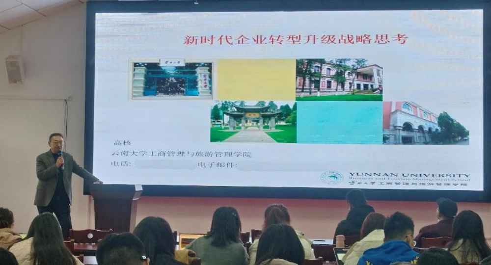 2024年12月6日,在崇德楼512教室,伟德国际1946邀请到云南大学高核教授带来主题为“新时代企业转型升级战略思考”的专题学术讲座。高核教授是教育部工商管理本科教学指导委员会委员、全国工商管理专业硕士教育指导委员会委员、教育部双创教育导师库入库专家。讲座由伟德国际1946副经理胡北明教授主持,公司部分教师和全体硕博研究生参加讲座。