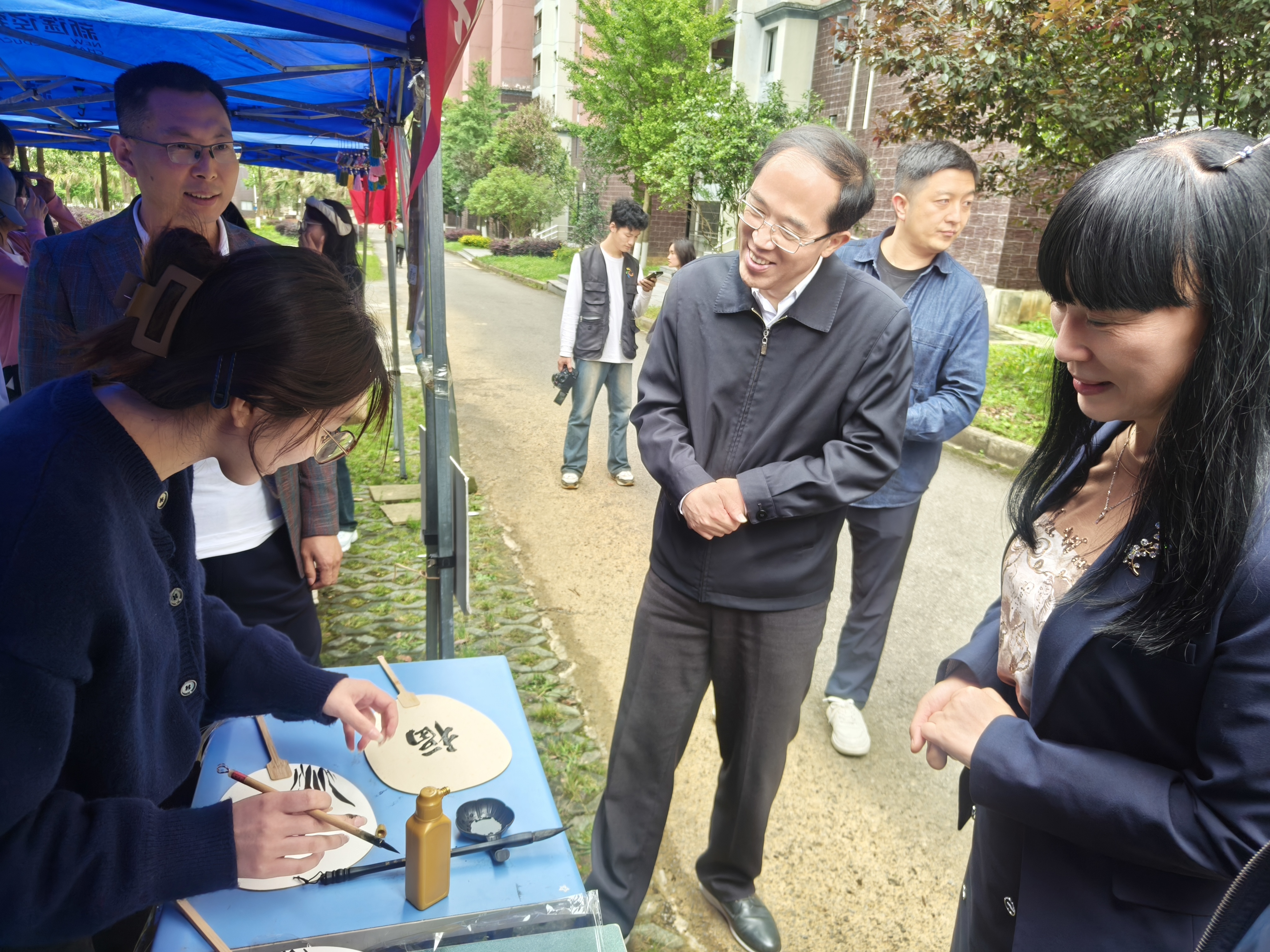 在有奖投壶活动中,参与者签到后获10支箭矢,于2米外投掷到筒里,按照投中箭矢的数量获得相应的奖品,吸引了众多的老员工和小朋友参与,趣味性十足;毛笔书法展示提供空白纸扇,供师生书写端午诗句或创作个性化扇面,传递节日祝福;端午挂件DIY活动备齐粽叶、麻绳、干花等材料,参与者可亲手制作迷你香囊或装饰摆件,增加了节日的氛围。
