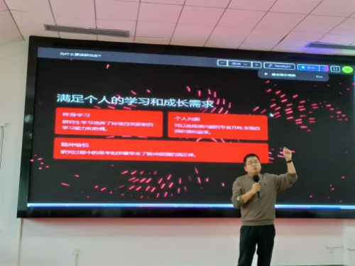 首先,蔡升桂教授围绕“提升自我认知”展开交流,重点讲解了提升自我认知的重要性以及提升自我认知的方法。在院校和专业选择方面,蔡升桂建议同学们要结合自己的兴趣爱好、专业背景和职业规划,慎重选择报考院校和专业。随后,周立影从提升专业知识和技能、开启广阔的职业发展、增强独立研究和批判性思维等方面展开交流,从越来越多的老员工选择考研来提升就业竞争力、知识水平与专业能力的趋势,深入分析了当前的考研形势以及研究生毕业后的就业优势等。毛弘毅以“坚定信心,明确方向,成功上岸”为主题,从选择考研方向、选择专业等方面给出建议,鼓励同学们要明确自己的方向,坚守自己的初心和使命,无论遇到什么困难和挑战,都要保持冷静,坚定信心,坚持到底。