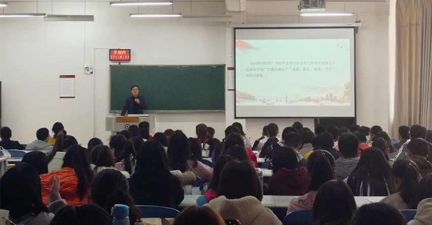 余颂书记从“爱国、励志、求真、力行”四个方面为基点展开课程讲解。他给同学们分享了成功人士模式的公式:成功=勇于拼搏+谋求方法+把握机遇,并告诉同学们在大学要明确定位,找到自己的奋斗目标。最后他借用清华董事长的四句话赠予同学们:1、方向比努力重要;2、能力胜于知识;3、健康比成绩重要;4、情商比智商更重要。